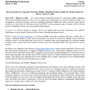 Read more >Dear KCEC Members, A Fire Weather Watch is in effect Saturday from 12 PM to 10 PM across Kit Carson Electric Cooperative’s entire service territory. Forecasts call for strong winds and critical fire weather conditions, increasing wildfire risk across northern New Mexico this weekend. To help protect our communities...
